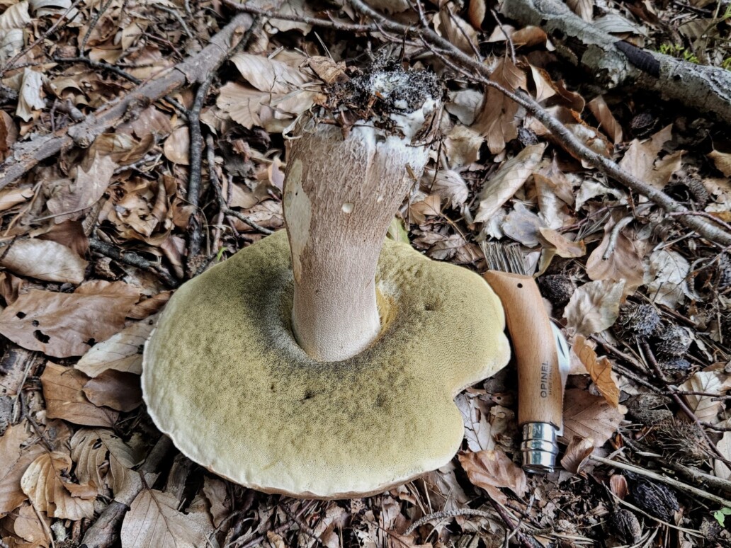 Ein beeindruckend großer Sommersteinpilz. An der olivgrünen Färbung der Röhren lässt sich erkennen, dass er bereits ausgesport hat. Solche Fruchtkörper sind nicht mehr genießbar und sollten direkt im Wald bleiben.